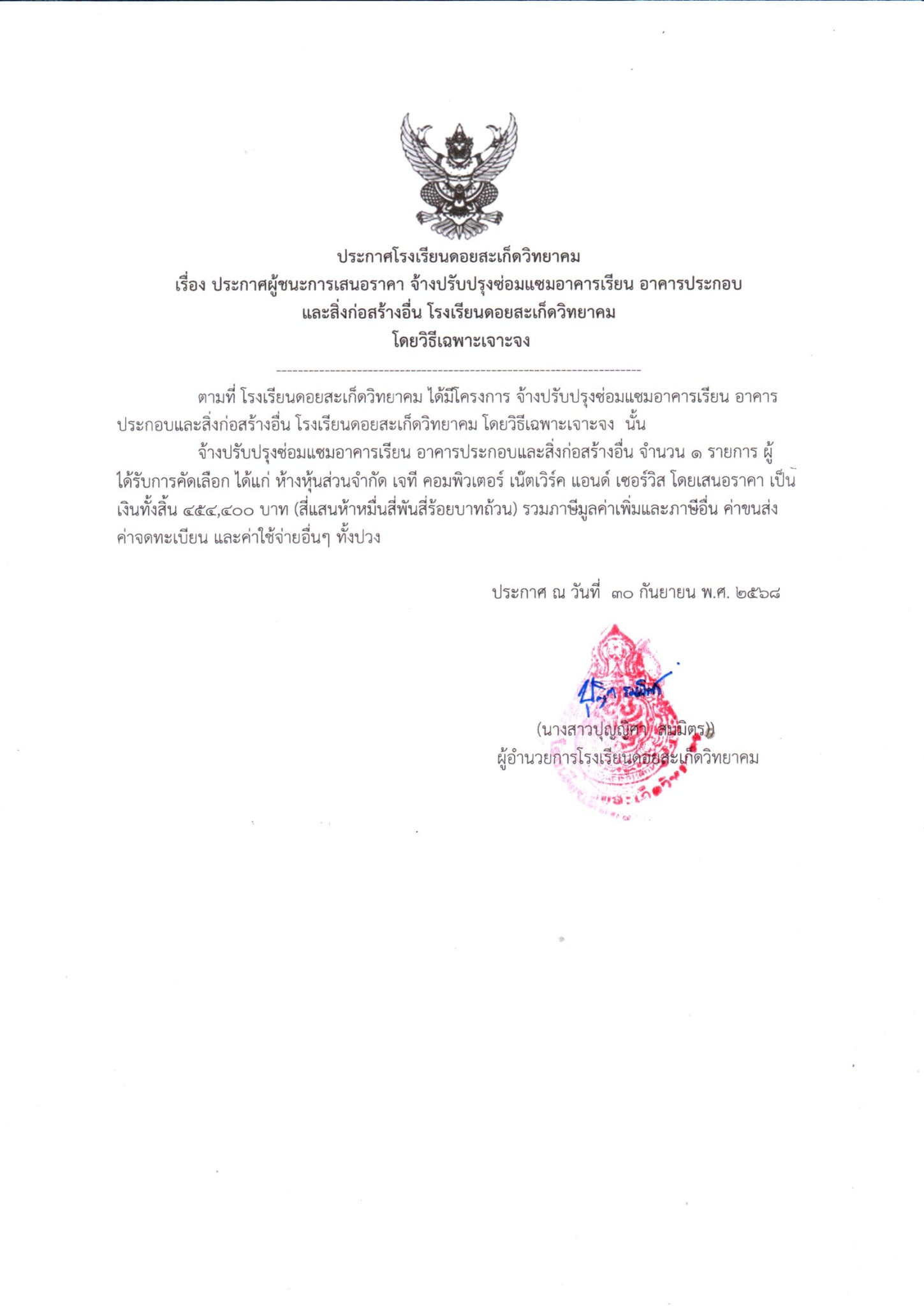 ประกาศผู้ชนะการเสนอราคา จ้างปรับปรุงซ่อมแซมอาคารเรียน อาคารประกอบและสิ่งก่อสร้างอื่นๆ โรงเรียนดอยสะเก็ดวิทยาคม โดยวิธีเฉพาะเจาะจง